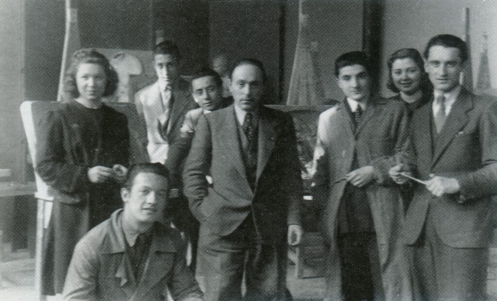 1940 – La scuola di plastica, al centro Cleto Tomba, terzo da destra Ugo Guidi